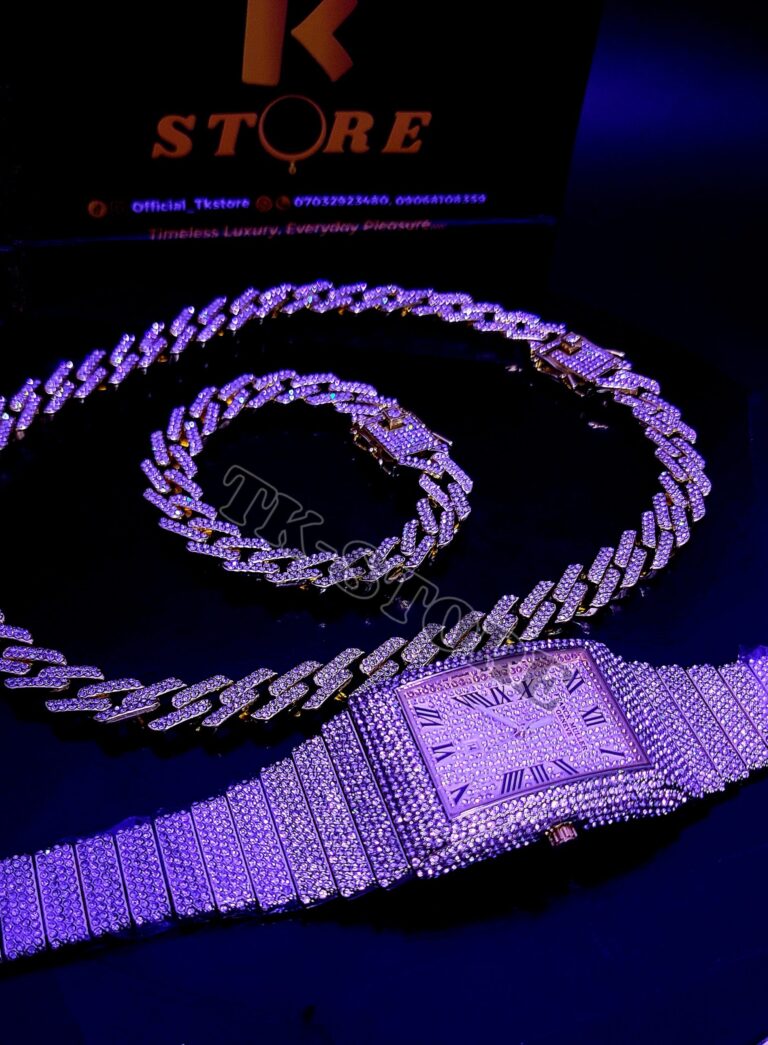 Full Package: Luxury Ice Watch + Hand Chain + Neck Chain + Perfume + Free Delivery: 130,000 Naira